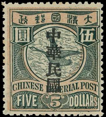 1912 Shanghai Republican opt type 38, on $5 myrtle & salmon, fine and fresh large part o.g. SG 206