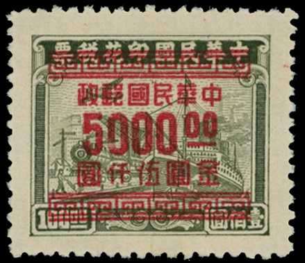 1949 Gold Yuan surch on 'Transport' revenues, $5000 on $100 olive Dah Tung recess printing, prepared for use but not issued, scarce (see footnote after SG 1151)