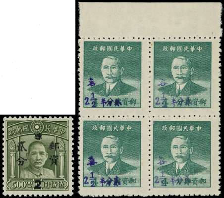 1949 Silver Yuan 2c on $500 olive, fresh part original gum single and ½c. on 4c. grey-green upper marginal block of four unused without gum as issued, hand stamped on the reverse. Fine. SG 1330-1331; Chan S139-140.