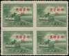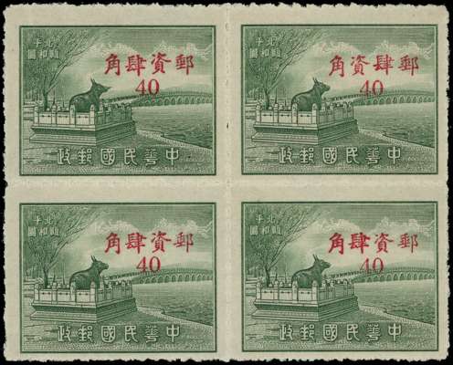 1949 40c grey-green "Bronze Bull", in block of four, with upper right stamp showing the second and third characters of surcharge transposed, fine unused as issued, a scarce variety which occurs once per sheet of 300. SG 1359/a