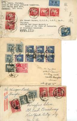 Selection comprising North China and East China two combination envelopes to England and USA with a range of issues; a further envelope with North China issues. Fine. (3)