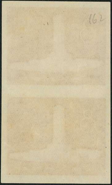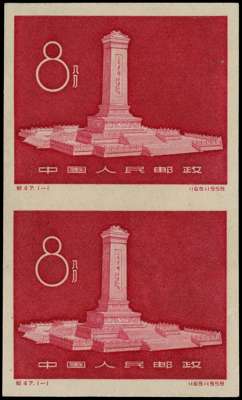 1958 Unveiling of the People's Hero's Monument 8f carmine, imperforate plate proof vertical pair, in issued colour, rare as only one sheet of ninety is believed to have been released. Experts & Consultants Certificate (2007), SG 1749var