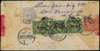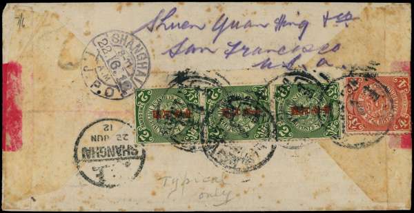FOREIGN POST OFFICES: 1912 (June) native red band envelope to San Francisco franked by China Imperial Post 1905-10 4c scarlet, 1912 Republic of China overprint 2c green, vertical strip of three, all tied Canton datestamps, also good strike of ‘SHANGHAI/22.16.12/I.J.P.O.' cds in purple, minor ageing otherwise fine