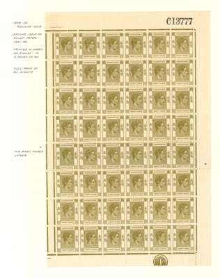 1945 30c yellow-olive perf 14½ x 14 right pane of sixty, Requisition C at top right, mounted on album page with one stamp hinged, (two rows folded under to fit the page). Fresh, an unusual survivor. SG 151a, £1800