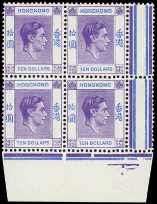 1946 $10 bright violet and ultramarine lower right corner block of four from the left pane, from Requisition D, unmounted o.g. R10/6 varieties including Chinese character ‘TEN’ broken. SG 162, £560