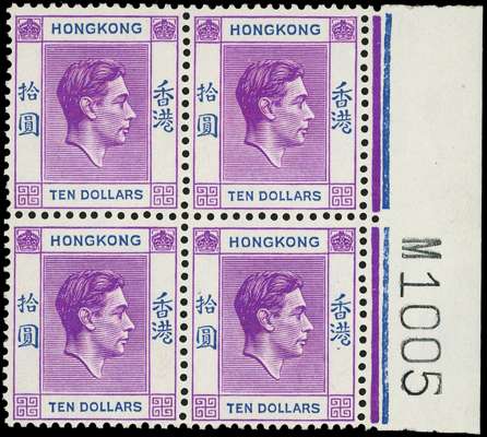 1950 $10 bright reddish purple and ultramarine right marginal block of four with Requisition M, unmounted o.g. Very fine. SG 162b, £800