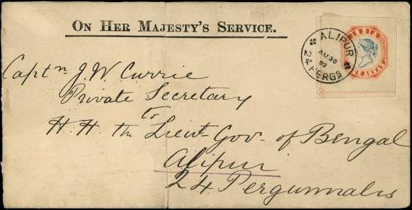 1891 4a vermillion and blue on yellowish wove paper, watermarked Arms of Great Britain, large margined example with wavy lines and rosettes printed in vermilion pos. 23, POSTALLY USED on O.H.M.S cover, tied by Alipur 24 Pergs cds for AU 30 92, backstamped by Alipur DELY receiving mark for same day, envelope has been reduced at left and vertically separated and reinforced by hinges, still a remarkable and rare item. Spence 13