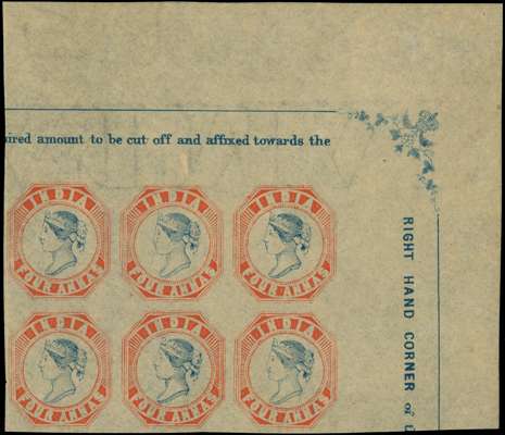 1894 4a vermillion and pale blue, on thin yellowish almost pelure paper watermarked ‘J WHATMAN’ in upper right block of six pos. 4-6 & 10-12, (3x2) with marginal inscriptions and corner ornaments, small paper inclusion, nevertheless fine. Spence 39