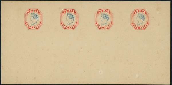 1890 4a red and pale blue on medium white wove paper, with ‘Specimen.’ printed at the back, horizontal row of four impressions, slight stains, otherwise fine. Spence 52