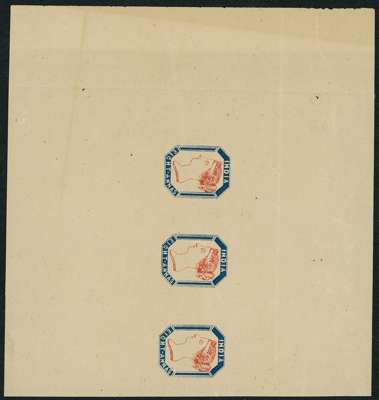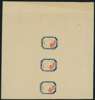 1890 8a pale blue frame and orange-red head, horizontal strip of three impressions (135x124mm) on yellowish wove paper, pos. 1-3, tear at upper left and creasing to piece, otherwise fine. Spence 3