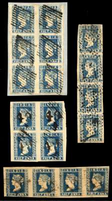 1854 ½a blue Die I, used collection of multiples, with touching to large margins, including: block of four, cancelled by ‘43’ type 4 cancel for Mhow, vertical strip and horizontal strip of four, and block of six used on piece cancelled by rhomboid of bars, mixed condition, with some faults, otherwise fine, an ideal lot for plate reconstructions. SG 2