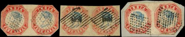 1855 4a blue and red 4th printing (Head Die III, Frame Die II), trio of horizontal pairs, (with one used on piece) cut square to good margins, cancelled by numeral rhomboid or diamond of dots, some faults, with traces of toning and paper adhesion, otherwise fine, collectable examples. SG 23 £7,500+