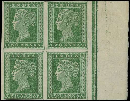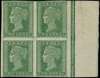 1854 2a green, right hand marginal block of four, wmk inverted and reversed, unused without gum as issued, some creasing, otherwise fine, scarce multiple. BPA Certificate (2021), SG 31 £1,800+