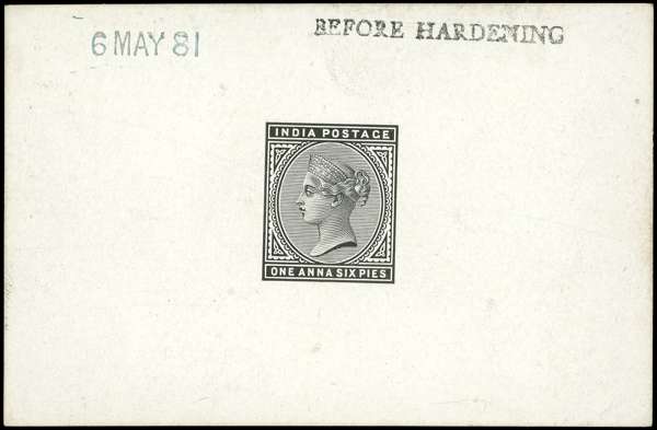 1882 QV 1a6p die proof on glazed card, (92x60mm) endorsed ‘BEFORE HARDENING’ dated 6 MAY 81, fine. SG 90var