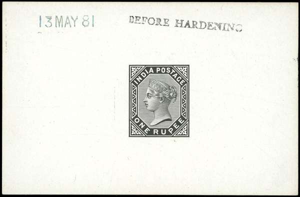1882 QV 1r die proof on glazed card, (92x60mm) endorsed ‘BEFORE HARDENING’ dated 13 MAY 81, fine. SG 101var
