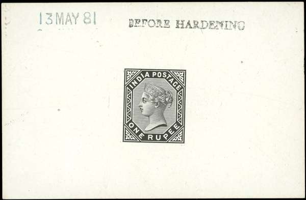 1882 QV 1r die proof on glazed card, (92x60mm) endorsed ‘BEFORE HARDENING’ dated 13 MAY 81, fine. SG 101var