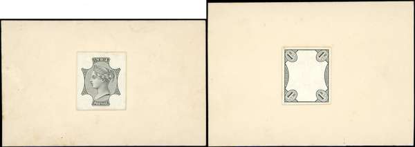 1892 1r cut down die proofs of the central head vignette and outer frame (21x24mm) mounted on thick card, unusual and scarce. SG 105var
