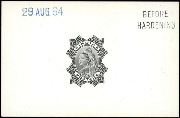 1894 die proof in black on glazed card (92x60mm) of the central head vignette for the 1895 2r to 5r high values, endorsed ‘BEFORE HARDENING’ and dated 29 AUG 94, very fine, most attractive. SG 107-09var