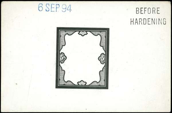 1895 QV 5r die proof of the outer frame in black on glazed card (92x60mm) endorsed ‘BEFORE HARDENING’ dated 6 SEP 94, crease at lower left, otherwise fine, attractive. SG 109var