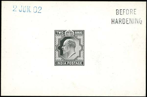 1902 KEVII 2a die proof on glazed card, (92x60mm) endorsed ‘BEFORE HARDENING’ dated 2 JUN 02 , fine. SG 124var