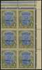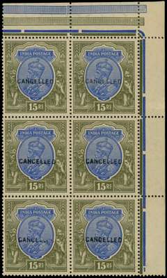 1911-23 KGV 15 blue and olive wmk single star upper right marginal block of six, optd ‘CANCELLED’ Samuel type GB14, brilliant o.g. upper corner perf separation to selvedge with sensible hinge reinforcement, nevertheless a wonderfully fresh and scarce item. SG 190var