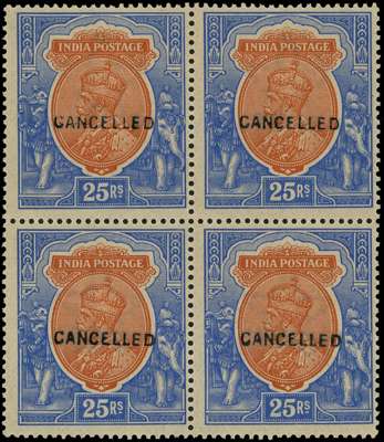 1911-23 KGV 25r orange and blue wmk single star, block of four, optd ‘CANCELLED’ Samuel type GB14, brilliant o.g. a wonderful fresh appearance, a fine and rare piece. SG 191var