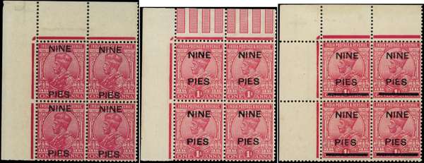 1921 ‘NINE PIES’ on 1a, three different ESSAY surcharges in large sans-serif letters, respectively wide spacing (15.5mm), narrow spacing (8.5mm) and narrow spacing with bar, all in upper left marginal blocks of four, brilliant o.g. with first 1a block on aniline carmine, the others in rose-carmine, odd imperfections, last block with slight gum crease affecting upper pair only, nevertheless a superb and rare trio of the three different essays. SG 192-4var Ex. CRL 13.12.95 Lot 323