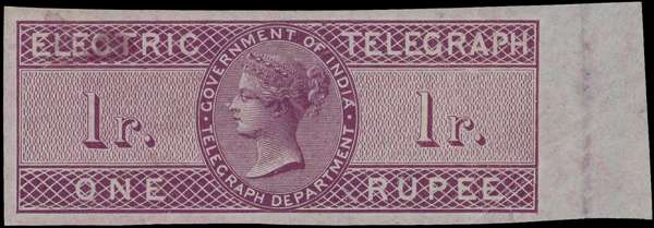 Telegraphs. 1860 (Jan) "ELECTRIC TELEGRAPH" 1r reddish purple, IMPERFORATE IMPRIMATUR, marginal from right of sheet with very large margins on other sides. Minor blemishes mentioned for accuracy (faint corner bend, small adhesion at upper left), otherwise very fine and rare. One of just four examples recorded in private hands (plus two in the Royal Collection).