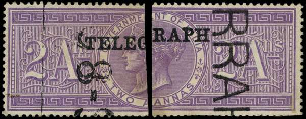 Telegraph. 1881 (Aug) -82 2a bright lilac, type T24 opt ("TELEGRAPH" 26x2¾mm in bold type, without stop) of MADRAS on fiscal stamp, left and right halves (reconstructing the complete opt), used with neat part datestamps. Some partly clipped perfs (minor on the left half), otherwise fine and fresh. The rarest basic stamp of the entire Indian Telegraph series, the left half much the finer of two so far recorded, the right half apparently unique, making this a wonderful and unprecedented opportunity. [Hiscocks commented of this stamp: "The printing ... is reported, but no specimens have been observed.", no doubt following Hausburg (p.177) who remarked in 1907 "no specimen is at present known to collectors".]