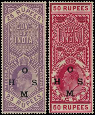 Official Telegraph. 1908 KEVII "OHMS" set of 5 to 50r, large part o.g. to o.g. Odd gum bends, and a couple of lower values with fractionally toned gum as usual, still a very fine set with fresh colours.