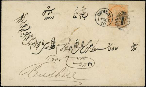 POSTAL HISTORY: 1870 (17 Oct) cover to Bushire franked 2a tied Bombay ‘1’ duplex, back stamped Bushire arrival ‘OC 20/70’
