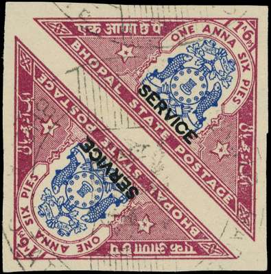 OFFICIAL: 1935-39 1a6p blue and claret, IMPERFORATE pair, lightly used, very fine and rare. SG O331d
