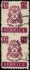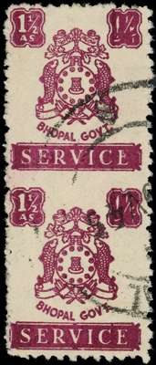 OFFICIAL: 1944-49 ‘Arms’ 1½a claret, vertical pair, ERROR IMPERFORATE BETWEEN, lightly used, minor surface blemish to top stamp, still fine example of this rare stamp. SG O353b £750