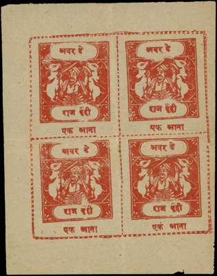 1917 1a vermilion, on thin wove, table type ‘A’ the special ‘OUR DAY’ printing, from the unique Benns setting 15, with ‘RAJ BUNDI’ in in lower tablet and ‘ONE ANNA’ in bottom margin, as complete sheet, unused, roulette separation and small tear at lower right, not affecting adhesives, a very rare item, seldom offered as an intact sheet, the first example we can recall offering for many years! Desirable thus. SG 19var £1600+