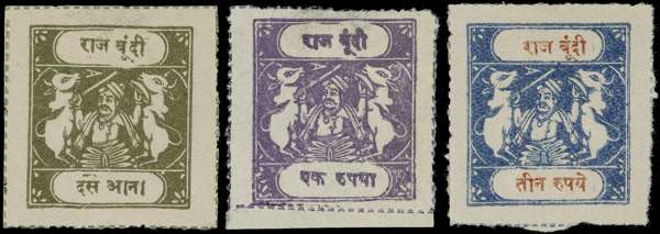 1917-41 Tablet type ‘C’ trio on thin wove, including 10a brown olive, 1r lilac and 3r blue and red-brown, Benns setting 9 & 11, (setting 9 for 1r rest setting 11) unused, fine and fresh appearnce.SG 43-47