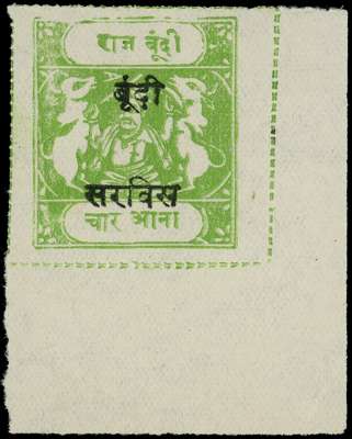 OFFICIAL: 1915-41 4a bright apple-green on medium wove opt type O1, tablet type ‘C’ Benns setting 44, pos.4 with intact lower margins, unused, a very fine example of this rare stamp, for the connoisseur. SG O19dA, £2500