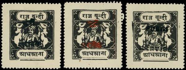 OFFICIAL: 1915-41 ½a black on medium wove, tablet type H Benns setting 56, opt type O1 in black & in red, and opt O2 in black large part o.g. a fine trio. SG O48,aA-48B