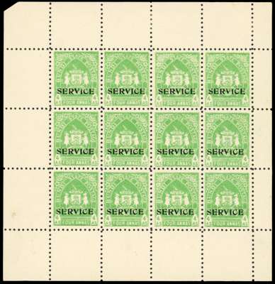 OFFICIAL: 1941 ‘Arms’ 4a bright green, opt ‘SERVICE’ type O4, in black as complete sheet of twelve (3x4), brilliant o.g., very fine, scarce as a complete sheet. SG O57 £1440+