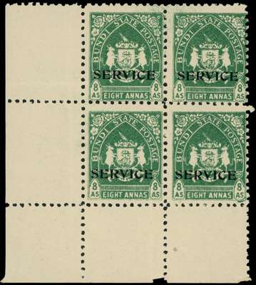 OFFICIAL: 1941 ‘Arms’ 8a dull green opt ‘SERVICE’ type O4, in black, in lower left marginal block of four, brilliant o.g., minor bends as typically seen with this issue, still a fine and rare multiple. SG O58 £1700+