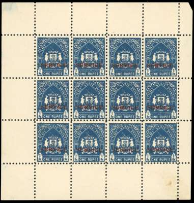 OFFICIAL: 1941 ‘Arms’ 1r deep blue opt ‘SERVICE’ type O4, in red, as complete sheet of twelve (3x4), brilliant o.g., hinged in margin only, minor perf separation at top, still very fine and rare in this format, SG O59 £5700+