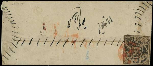 1866 local native envelope franked by Kashmir, old rectangular ½a black (type 5, printed from a single die), on reverse, tied by red Srinagar seal in red, a wonderfully attractive and rare cover, choice quality, offered with original contents. SG 87
