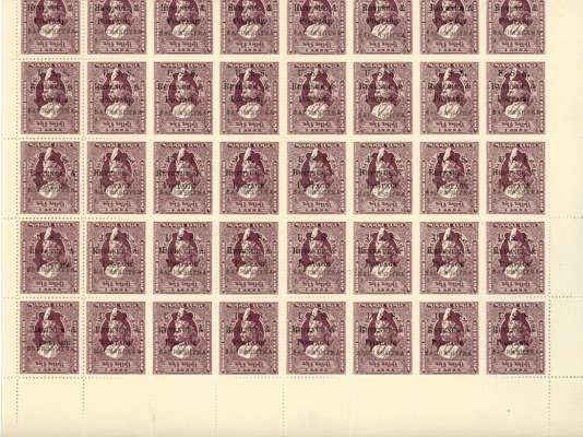 1949 1a purple provisional, type 21 opt on Bhavnagar Court Fee, lower marginal block of forty (8x5, i.e. half a of sheet of eighty), brilliant large part o.g. some paper adhesions on reverse, still a fine multiple. SG 60