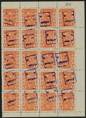 1948-49 Bundi 4 orange, H/S type 1 in violet, complete sheet of twenty (4x5), showing sheet number ‘264' less marginal selvedge at left, brilliant o.g. few minor bends, and small perf separation, otherwise fine, a scarce multiple. SG 5B £1300+