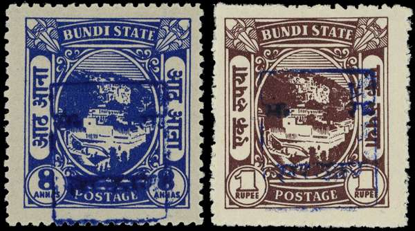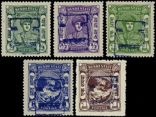 1948-49 Bundi type 1 H/S type 1 in blue, quintet including: ¼a blue-green, ½a violet, 1a yellow-green, 8a ultramarine and 1r chocolate, large part o.g. 1a with patch of gum loss, otherwise fine. SG 1C-7C