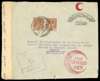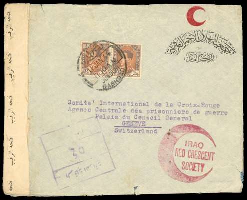 POSTAL HISTORY: 1944 (11 Jan) Red Crescent printed cover to Geneva, bearing 20f pair, tied Baghdad cds, censor seal and violet censor handstamp at left.