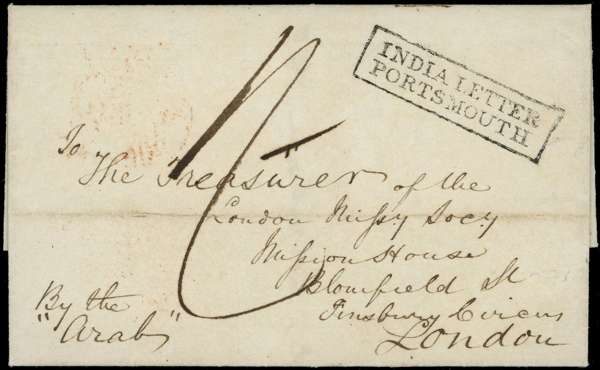 POSTAL HISTORY: 1838 stampless entire, Singapore to London bearing neat boxed “INDIA LETTER/ PORTSMOUTH” in black, the reverse with London arrival “21SP21/1838” in red. Central file crease, still most attractive.