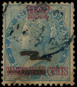 1869 'THREE HALF' deleted and '2' handwritten above in black manuscript on 1867 ½a blue of India, lightly cancelled by part cds; some faults nevertheless a very collectable example of this rare stamp. BPA Certificate (2023). SG 10, £6,500