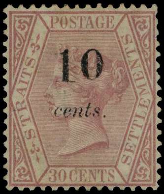 1880 (Mar) '10/cents.' on 30c claret, type 12(g) surcharge, unused, with part o.g. small central thin spot and light horizontal crease. Still a presentable example of this scarce type which occurs only four times in the setting of 60, at R7/2-5. cat £7,000 BPA cert (2023)
