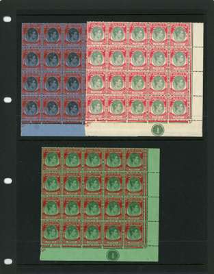 1938 $1, $2 and $5 lower right corner blocks of twenty with Plate numbers, unmounted o.g. Fine, save the $5 block has a little splitting, and gum loss on selvedge. SG 290-2, £2020