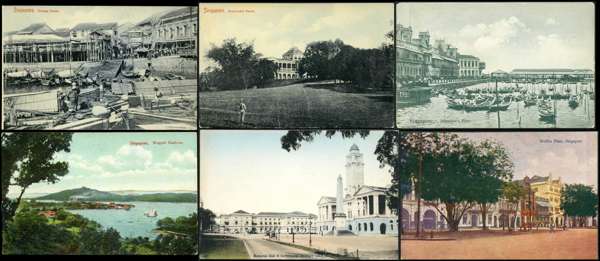 Group of 100 different vintage picture post cards, virtually all depicting views of Singapore and environs, in various styles including real photo (many coloured) and hand-painted, unused. Some imperfections including creasing, but overall a fine accumulation. Publishers include Raphael Tuck, Max Hilckes, and Wilson & Co.